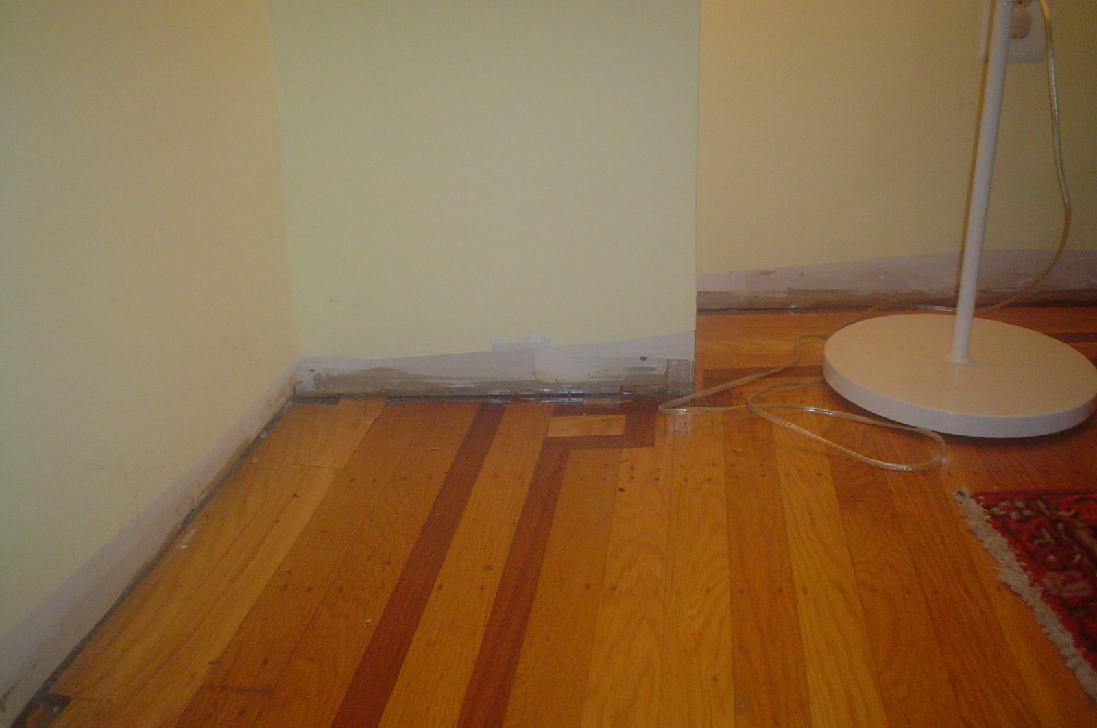 The picture below shows the living room wall without any baseboard molding. We had to remove the crumbling plaster walls in the living room and install dry wall with insulation.