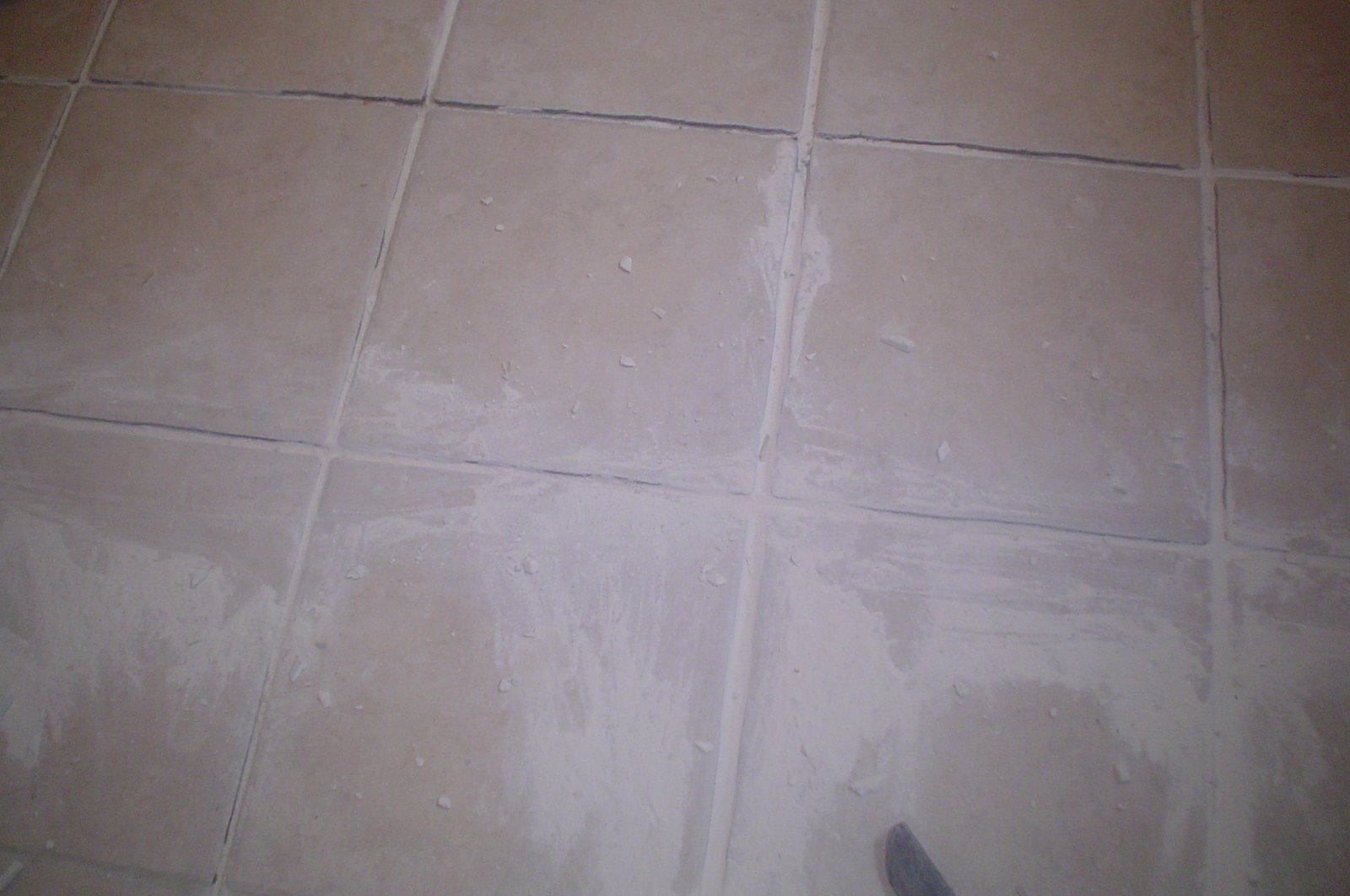 My husband was removing the old grout from the kitchen and everything was going so well. I was excited for the old (dirty) grout to be removed so that we could re-grout the tiles and seal them. I was also excited to start cooking again. This picture shows the tiles while we were removing the old grout: