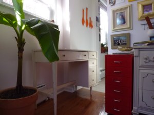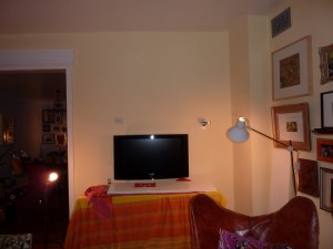 The first step in moving the TV into the living room was buying a credenza to place under the TV. We bought Ikea Trosby sideboard. This is the first big piece of furniture that we have purchased at Ikea and I am very pleased. It is very sturdy and the size is perfect. Also it has tons of storage and we use one side for Kiran’s toys and the other side for the DVD player and CDs.