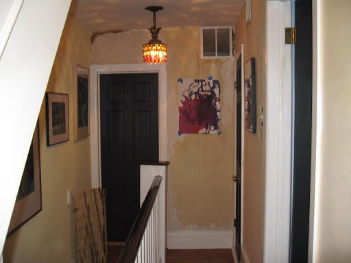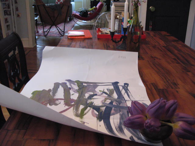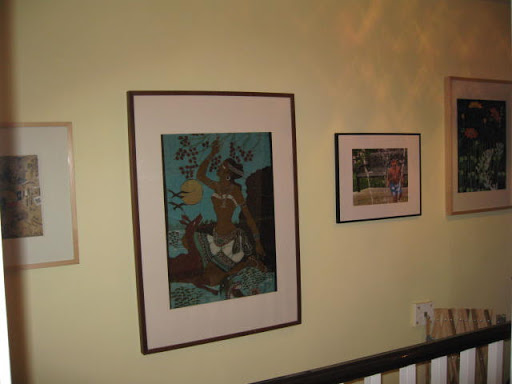 The fashion drawings to the left of the picture above were done by Scott’s mother. The picture of the girl on the grass is by Tierney Gearon (purchased from 20×200) and the pink swirly painting is also from 20×200 and is a print by Jennifer Sanchez. The nude charcoal drawing is also by Scott’s mother. The black and white painting to the left of the picture above is a collage Kiran and I did with Indian Ink.