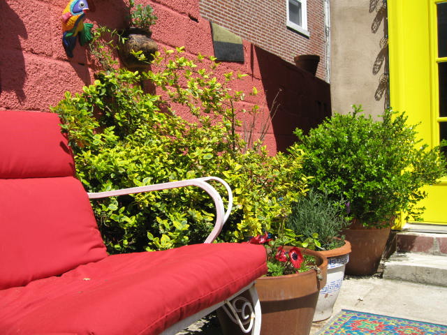 There is nothing more relaxing to me than sitting outside in our backyard and doing nothing! Well today was not that relaxing because I started to think about my backyard renovation. I don’t have any before pictures but the space back here was just awful. It was a tiny block of cement with pigeon droppings everwhere. First on my backyard To-Do-List is to prime and paint the window, shown in the picture below, yellow.