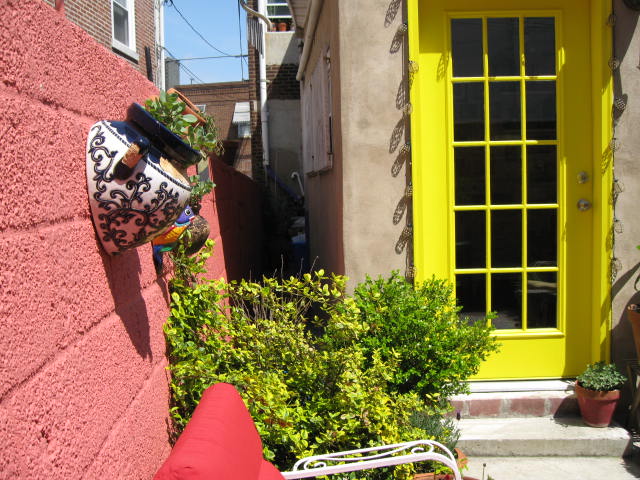 Third I would like Scott to build me a planter all the way at the end of this long narrow pathway (see below). The dining room windows look into this space and I would like to be able to see some green when looking out of the dining room. By the way I love my yellow door. We painted it with Fine Paints of Europe, Semi Gloss, in yellow.