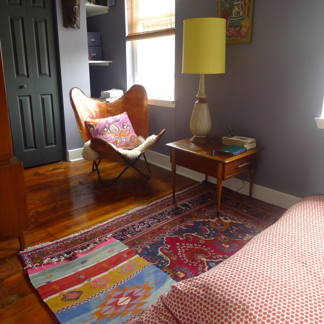 The paint is Benjamin Moore Aura, Tropical dusk in Matte. The butterfly chair was moved here from the living room. The rugs are a Turkish Kilim runner and Persian rug purchased a while ago on eBay.