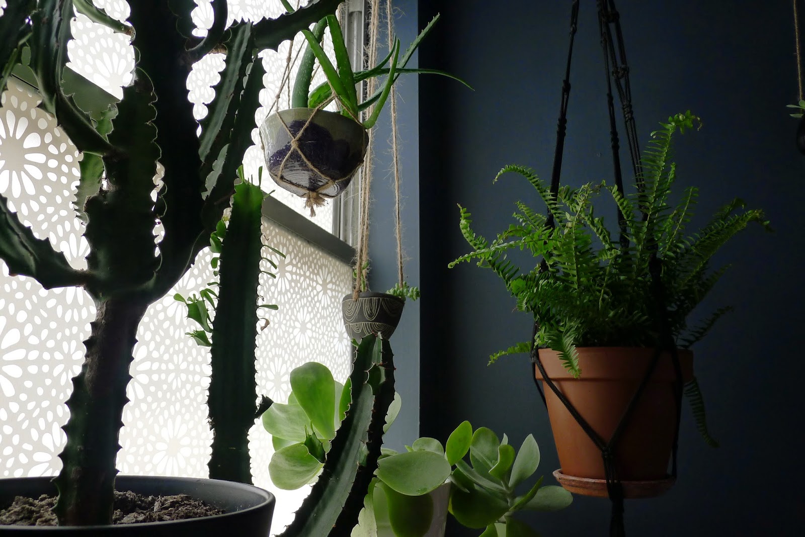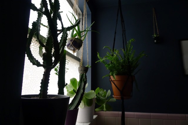 These plants love the humidity and light in the bathroom. I’ve lately become obsessed with hanging macrame planters and other hanging planters. They take up no space and really highlight the plants.