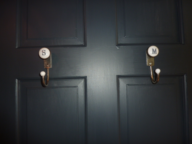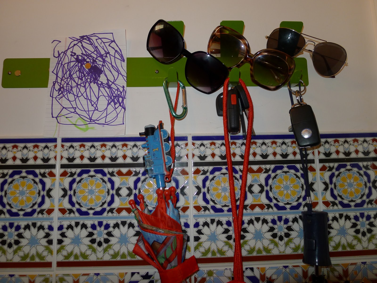 I bought the Triple Hook Up Strip in Olive (below) by Three by Three from Velocity Design a couple of years ago. It comes with four small magnets which hold notes, checks etc. The larger hooks are great for sunglasses and mail and we use the smaller hooks for umbrellas, Kiran’s sweaters etc.