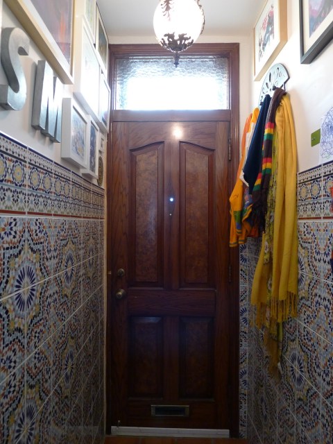 Since the vestibule is really small I opted to cover the walls in Moroccan tiles. I have always loved the designs of the tiles but it would have been very expensive to cover a large area with Moroccan tiles. We used Saltillo tiles for the floor. I bought the Moroccan cement tiles online. I wish I could remember the site but Berber Trading, Tazi Design and Casbah Decor all have similar tiles available. Here’s a close up of the tiles: