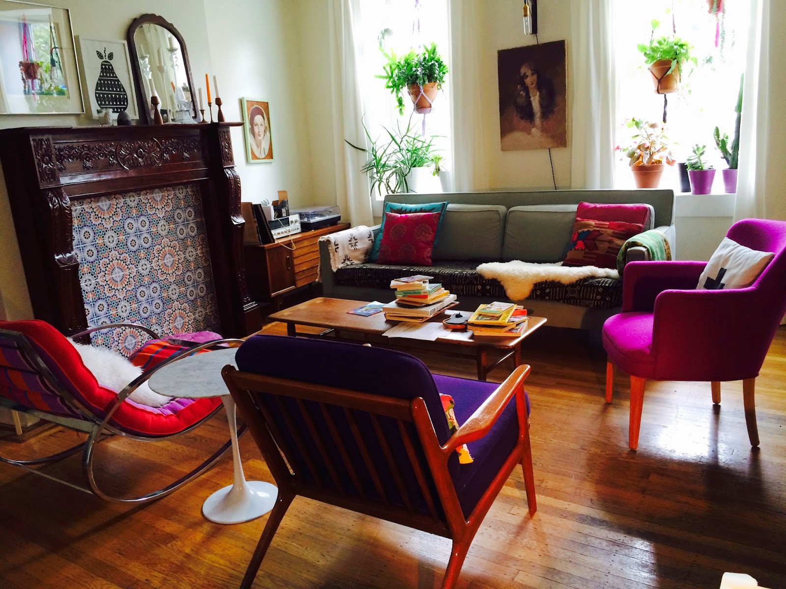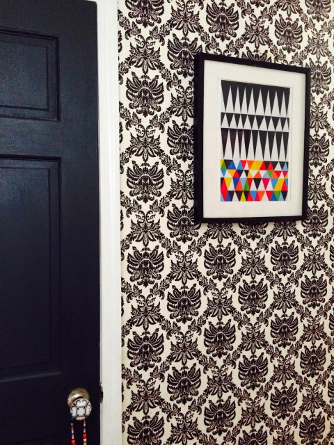 This beauty was an odd shape. At roughly 4×4 feet I couldn’t find a place for it. Then one day I decided to try it under our new coffee table in the living room and it looked perfect! If you are into rules then the general rule of rug placement is that the area rug should fit under all your furniture. However, like most rules regarding decoration this rule can be ignored. Here this smaller rug works because it adds pops of color and pattern without overwhelming the space.