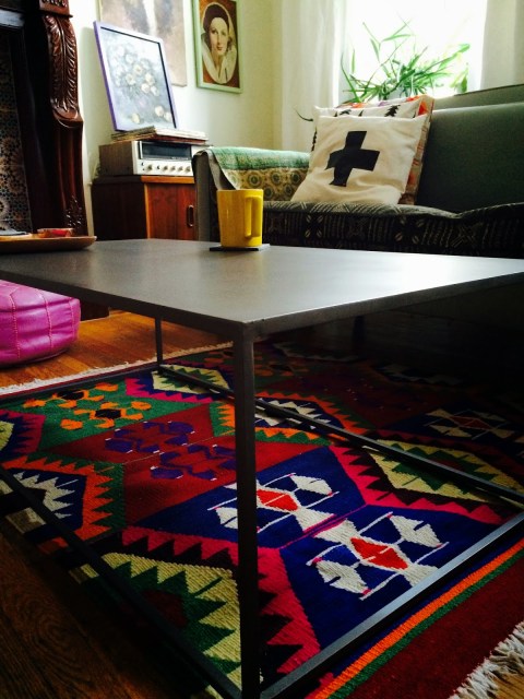 After this first encounter I would search through many rug stores, flea markets and online sources for something similar but I could never find anything as beautiful or as affordable. Then one day while I was scouring through vintage rugs on eBay I found a seller in Turkey selling the most beautiful and affordable new and vintage Anatolian kilims. In my excitement I bought several rugs as they were inexpensive and I could combine the cost of shipping. I am not generally an impulsive shopper. I painstakingly measure, re-measure and mull over future purchases before committing. This time was the exception. Without any forethought I purchased the rugs. I patiently waited several weeks for my heavy parcel of rugs to arrive. The day they arrived the mail person had to carry the parcel into the house because it was that heavy. Kiran and I madly ripped open the package. Under the plastic and brown paper wrapping there were four stunningly beautiful kilims perfectly folded. The colors were breathtaking and the designs magnificent. Over the next few years I moved the rugs around the house unsure of where they should go. Eventually the vintage faded kilim in muted colors went into the back room.